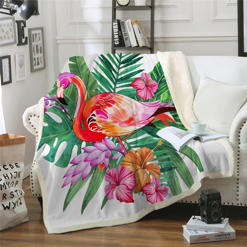 Les couleurs vives et chaleureuses de notre plaid vous mettront dans une humeur merveilleuse. Ses imprimés colorés de fleurs tropicales et de flamants roses sur fond blanc créent une atmosphère exotique et accueillante. Et le flamant rose veillera sur vous avec bienveillance, vous ne serez plus jamais seul !
