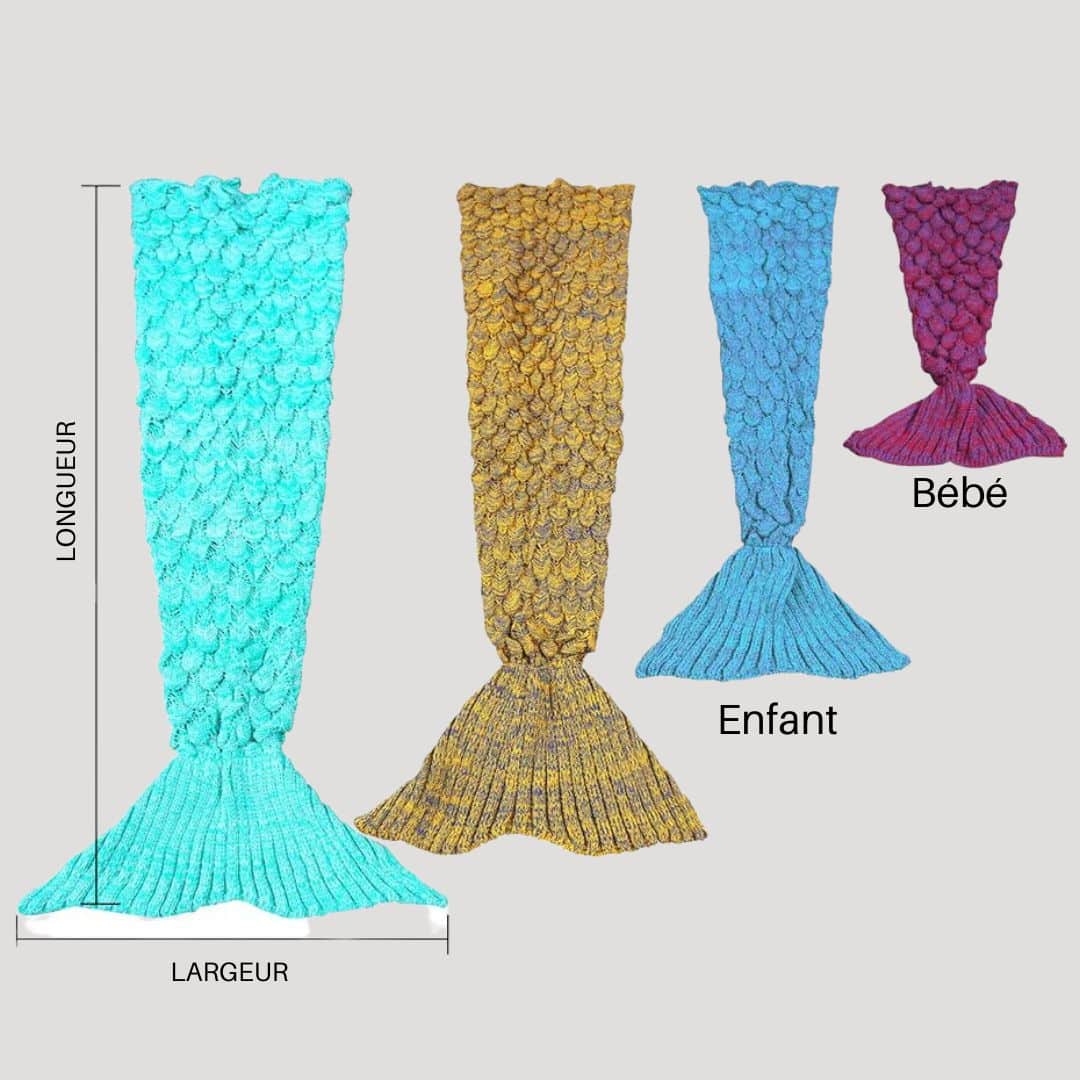 Nous avons pensé à tout, même à vos petits rêveurs en herbe ! Notre couverture en queue de sirène est disponible en taille enfant pour que vos filles puissent laisser libre cours à leur imagination et se glisser dans la peau d’Ariel de la Petite Sirène.